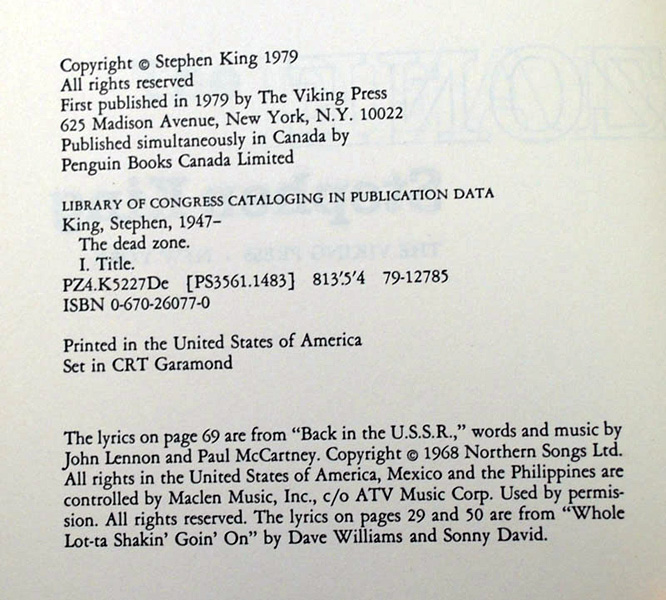 A first edition of 50,000 copies. Issued with a dustjacket and price of $11.95. As with many early Viking editions, this book can be hard to authenticate as a true 1st edition. Look at the tips below to help identify a 1st edition Dead Zone. Current Value = $50-$150 (highly dependent on condition)