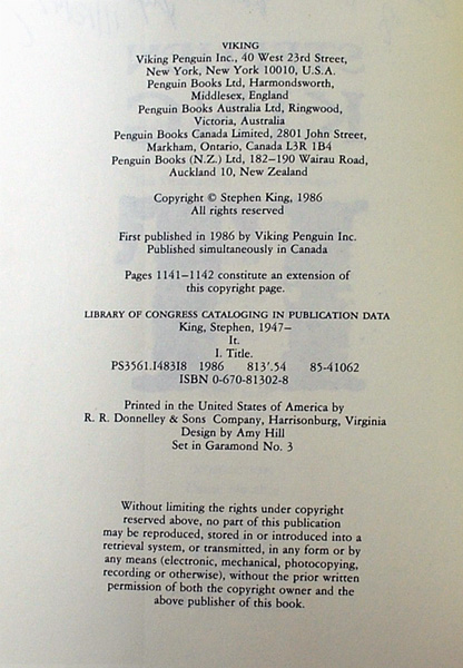 IT was the first time a publisher ever underestimated the number of books they would need to satisfy the demand. They really thought 400,000 would accommodate the supply and they weren't prepared for the bookseller market to demand more copies. IT, more than any other Stephen King novel, changed the number of first printing editions that Viking produced