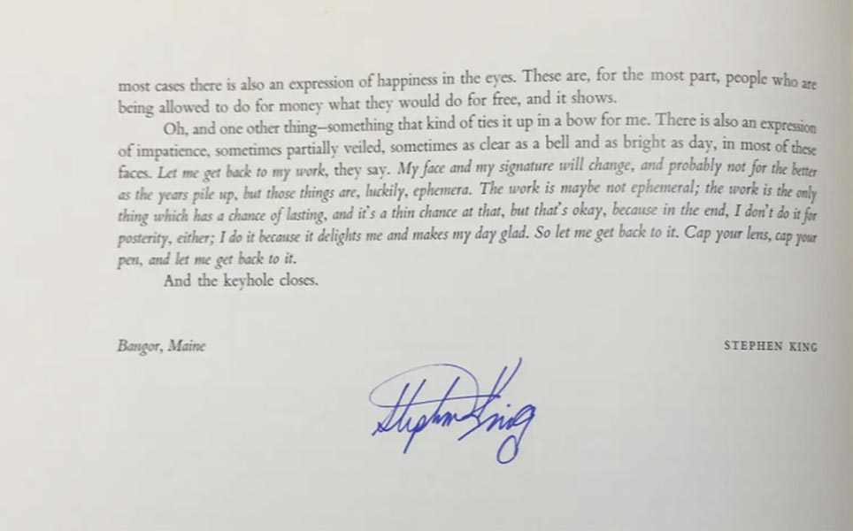 This is a book of autographs, with an introduction by Stephen King. Who explains the public's facination with autographs and put his own signature down at the end of his introduction.