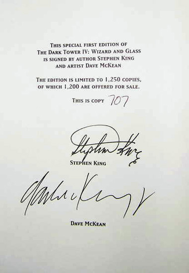 - Limited edition of 1,250 slipcased copies numbered, and signed by Stephen King and Dave McKean. $1,100 - $1,400