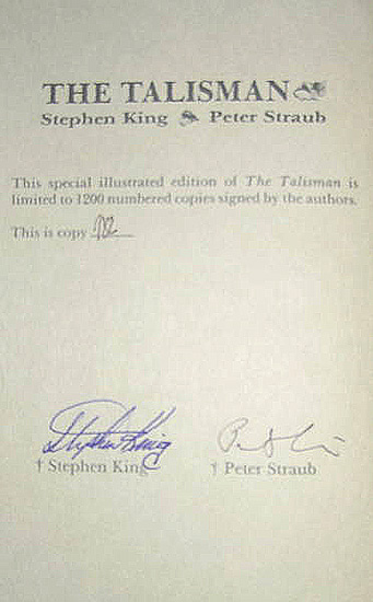 - A deluxe edition of 1,200 copies bound in white cloth, numbered and signed by King and Straub. The limitation page reads "This special illustrated edition of The Talisman is limited to 1200 numbered copies signed by the authors. This is copy ___. While is issue price back in '84 was $120, it costs more now. $1,350-$1,500