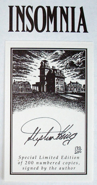 - Gift Edition of 2,000 copies. Royal blue cloth boards with silver lettering on the spine. Matching cloth slipcase. Issued without dust jacket. Dark blue page marker. Royal blue pastedowns with multiple printing of ‘insomnia’ in 2 types of font Listed as a "Special Limited Edition" it states right on the slipcase that the copy contains a facsimile Stephen King singature. Issue price £35. $125 - $175