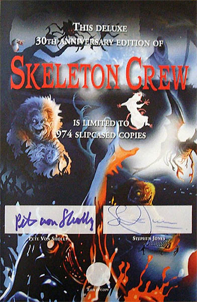 - A lettered edition of 26 copies, signed by Stephen King, Pete Von Sholly & Stephen Jones. Housed in a foil stamped traycase. Peter Von Sholly (who produced storyboards for Frank Darabont's movie adaption of The Mist) provided artwork for each story plus covers, slipcases, and endpapers, along with 26 pieces of original signed artwork, which one copy is included with each lettered edition. Issue price £2,295 (Approx $2,900) Current Value = $3,500 - $4,000 (est)